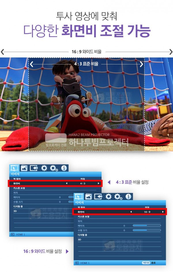 [화면] 밝기(안시): 4,300안시 / 명암비: 26,000:1 / 최대화면: 300인치 / 100인치투사거리: 3.9m / 키스톤(수동) / 컬러휠: 6분할 /